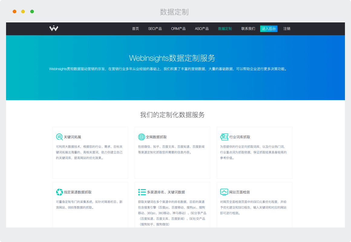 自主研发的数据采集平台,定时抓取各搜索平台的关键词数据,各类行业词库满足客户的关键词分析和搭建内部词库的需求。