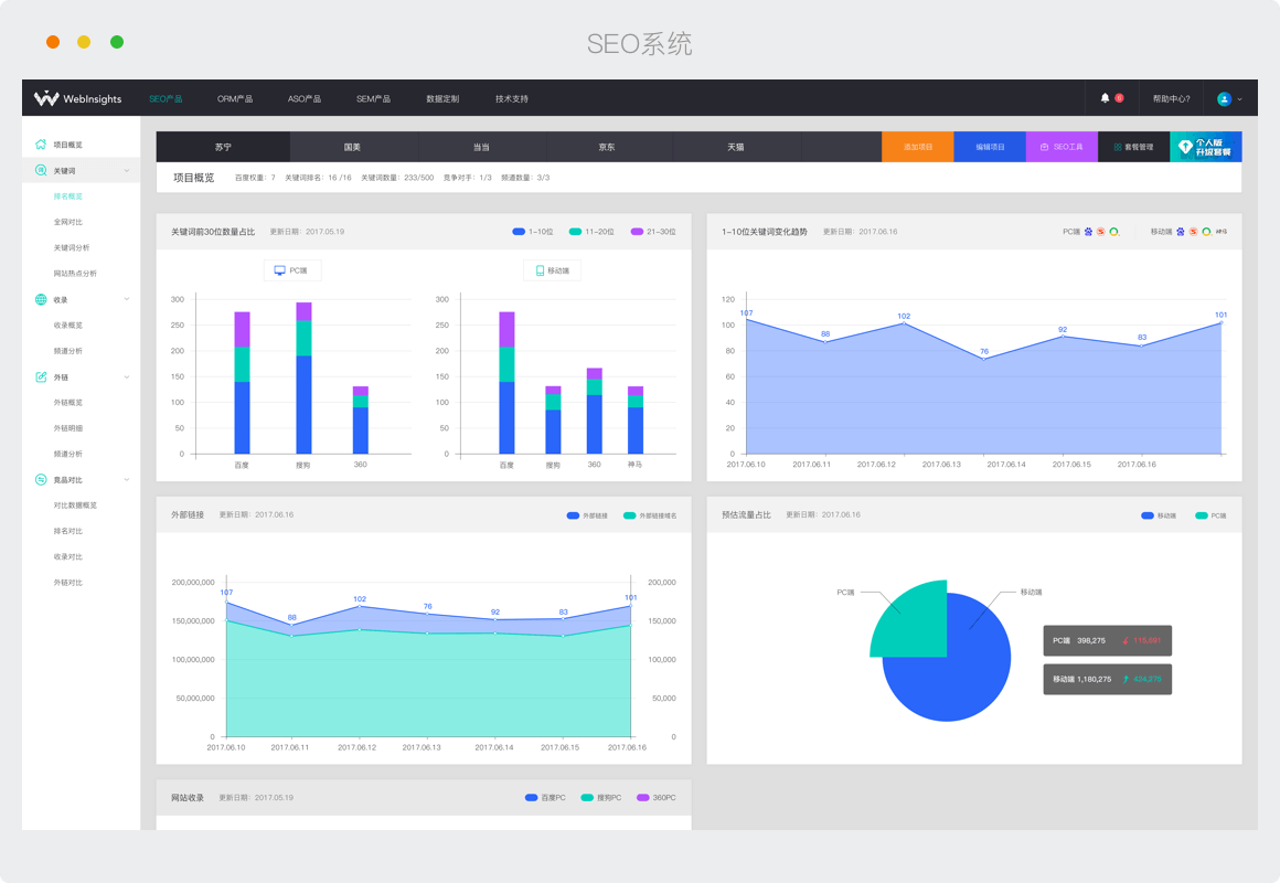 同时监控7大搜索平台的关键词排名,PC和移动端数据分别统计,便于客户对比分析。